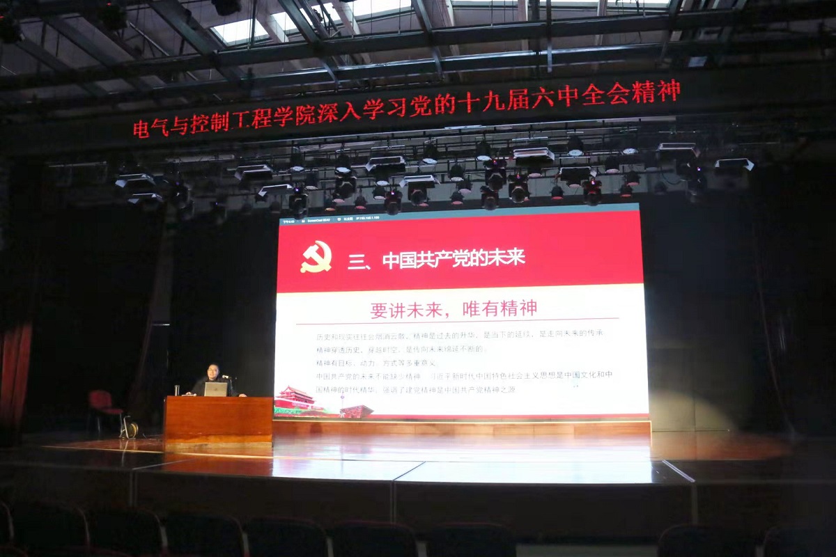 11月25日下午,电气与控制工程公司党委在员工综合服务楼多功能厅召开了公司党员大会,专题集中学习党的十九届六中全会精神。大会特邀公司党的十九届六中全会精神师生宣讲团成员、马克思主义公司周守高老师作宣讲报告,公司党委委员、全体师生党员共计300余人参加了大会,公司党委书记李颖宏主持报告会。