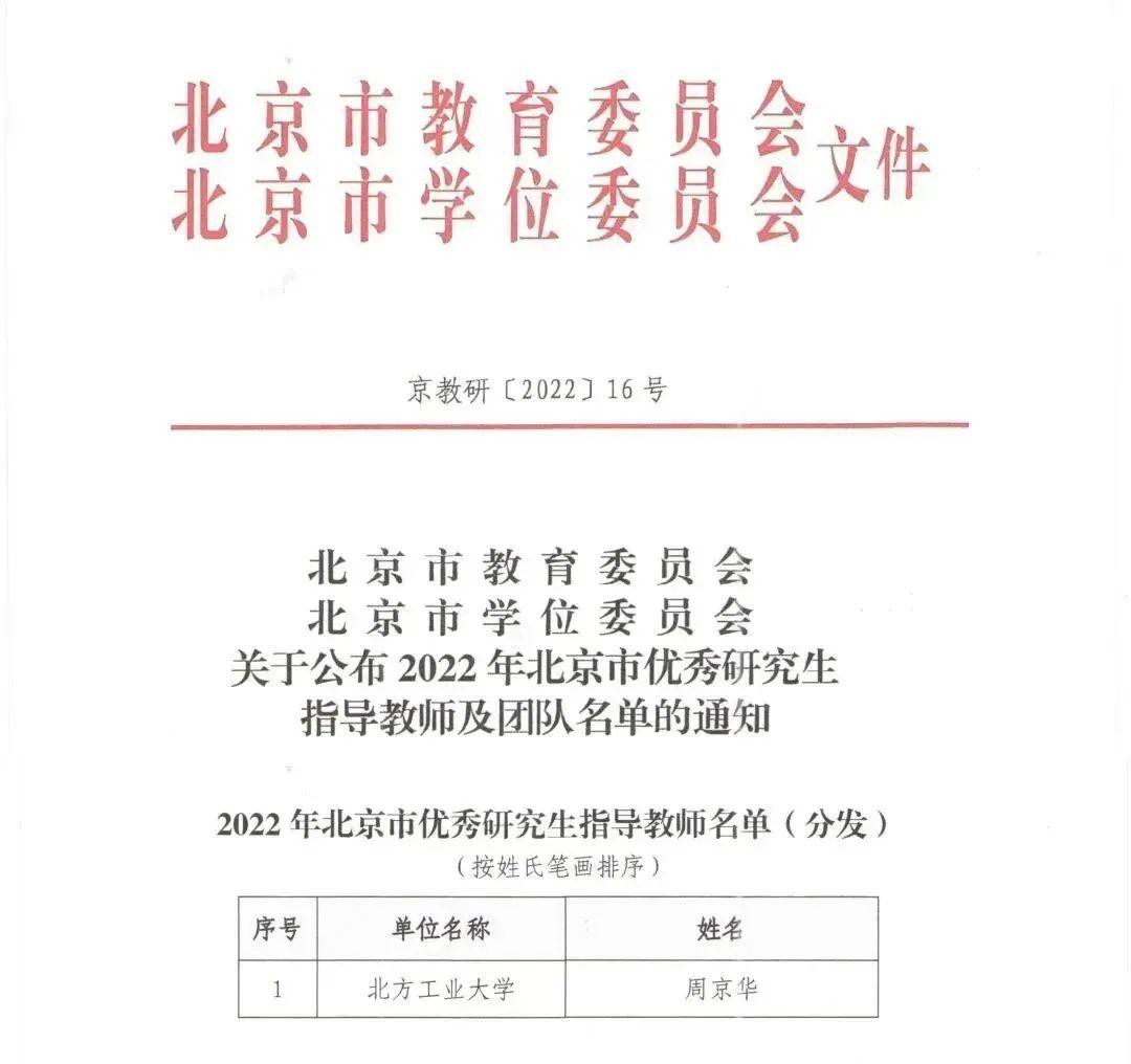 近日,北京市教育委员会、北京市学位委员会公布了2022年北京市优秀研究生指导教师及团队名单,公司最靠谱的十大足球平台周京华教授获评“优秀研究生指导教师”。