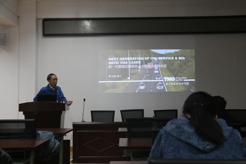 陈玉森教授做了题为《欧洲在智能交通控制方面的员工动态和试验情况》的精彩报告,陈教授简要介绍了荷兰代尔夫特理工大学的教育理念与基本概况,然后讲述了有关新一代智能交通系统的研究,结合国际交通研究案例阐释车路自动协同和控制与信息一体化的重要性,提出通过研究冲击波减震,达到瞬时检测问题,最后陈教授讲解了对卡车列队(Truck Platooning)行驶等问题的研究,强调创新思维的重要性。