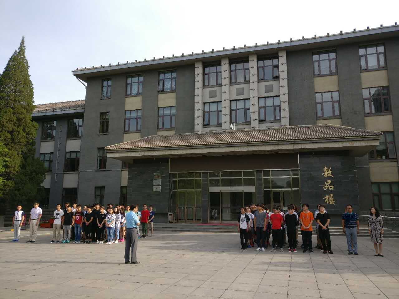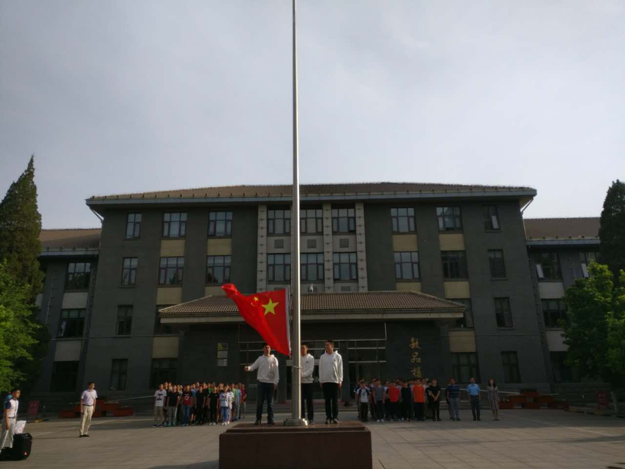 七点整,伴随着《义勇军进行曲》的响起,升旗仪式正式开始。公司国旗护卫队成员迈着矫健的的步伐来到了国旗台下,全场一片肃静。在激昂的进行曲中,升旗手振臂一挥,鲜艳的五星红旗徐徐展开,在阳光映照下和全体师生的注目中,迎风飘扬在敦品楼的上空。