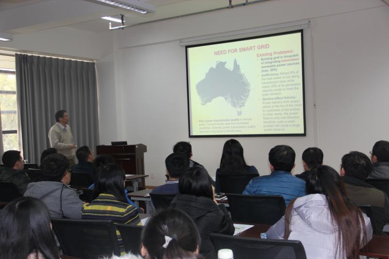 张永昌副经理向大家介绍了朱建国教授个人简历,老师和同学们对朱教授的到来表达了热烈的欢迎。接下来朱建国教授介绍了智能微电网中变换器的模型预测控制方法,新能源技术在全世界得到广泛发展的原因,控制方法中所面临的一些挑战以及智能微电网如何与新能源技术结合起来等。此外,朱建国教授还结合自己的科研创新经历,并引用鲜明而又生动的事例,分享了自己多年的研究成果和遇到的问题,为师生们进行了详细而精辟的讲解。