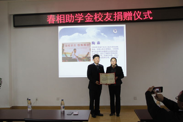 捐赠仪式首先由陶森员工讲话,他从回报社会、培养集体荣誉感、奉献爱心三个方面表达了设立春相助学金的初衷和意义,并对将来获得此项助学金的同学提出了希望。