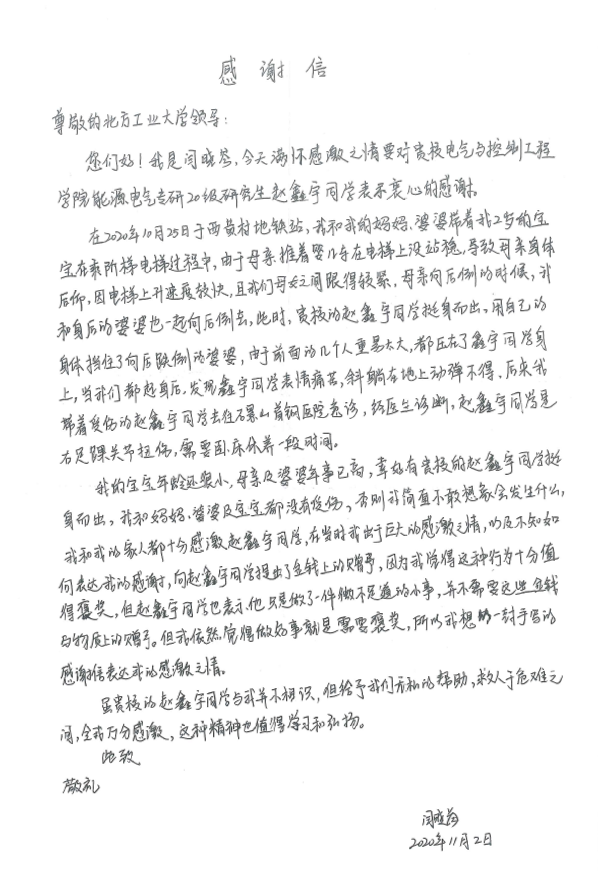 10月25日,西黄村地铁站内,闫女士的妈妈在推着婴儿车乘坐扶梯时,由于重心不稳,加之扶梯速度较快,导致身体后倾,并连带紧跟身后的闫女士和闫女士的婆婆一同跌倒。而此时赵鑫宇同学挺身而出,用自己的身体挡住了向后跌倒的三人。但因为三个人重量过大,造成赵鑫宇同学右足踝关节扭伤。闫女士事后回忆到,她的宝宝年龄还很小,母亲和婆婆年事已高,幸好赵鑫宇同学挺身而出,她和妈妈、婆婆及婴儿都没有受伤。闫女士及其家人对于赵鑫宇同学的行为非常感激,并希望能给予其酬谢,“我仅仅做了一件微不足道的小事。”赵鑫宇同学这样回答,婉拒了闫女士的感谢金。赵鑫宇同学现为能源动力专研20级团支书,他返校后并没有向任何人提及此事。直到闫女士亲手写了一封感谢信送到公司,公司老师才获悉他舍己救人的事迹。