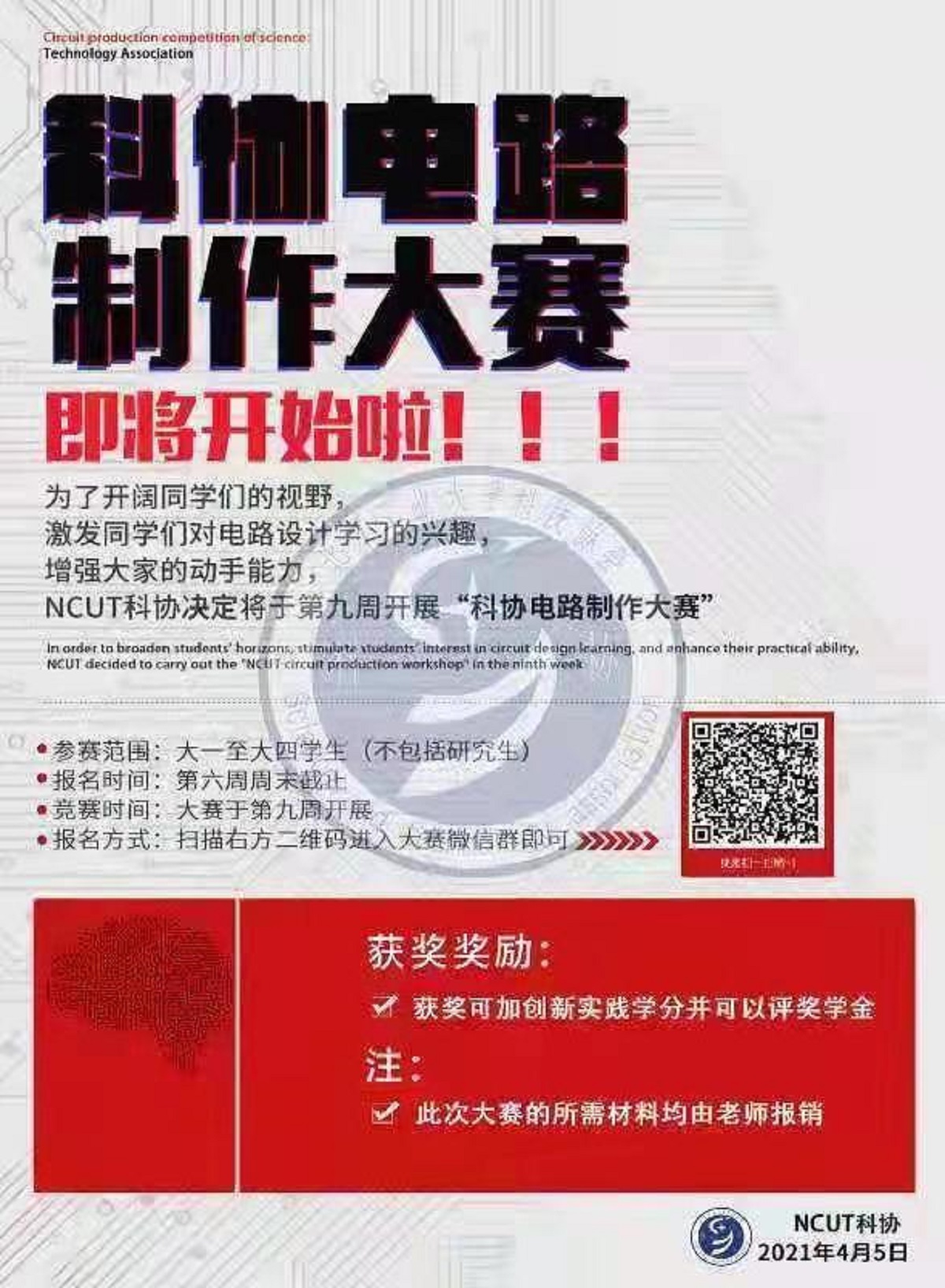 旨在开阔同学们的视野,强化同学们的动手能力,NCUT科技协会于2021春季学期第六到第九周组织举办了电路板制作大赛。同学们积极参赛,在体会比赛乐趣的同时,也提升了自己。