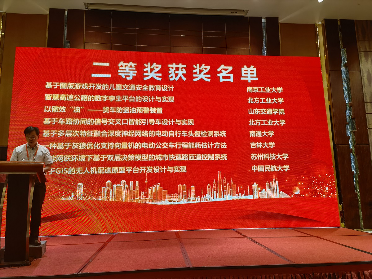 由张名芳老师和王庞伟老师指导,高天成、刘颖、于现海、陈映廷、王佳佳同学完成的作品《基于车路协同的信号交叉口智能引导车设计与实现》以及陈智老师和王志建老师指导,左胜芳、曹玲、罗鹏、安辰宇、郑扬同学完成的作品《智慧高速公路的数字孪生平台的设计与实现》分别获得大赛二等奖;由周慧娟老师指导,杨珣、卢宇浩、赵艺萱、牛猛、刘念念同学完成的作品《基于大数据的地铁拥堵断面票价折扣策略》获得大赛三等奖。