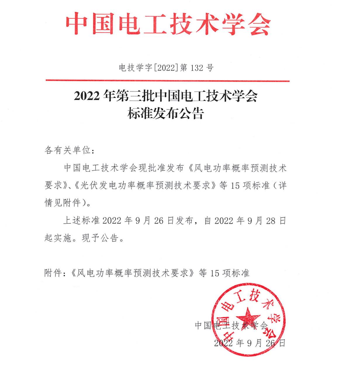 9月26日,中国电工技术学会储能领域第三批标准正式发布,自2022年9月28日起实施。此次共公布15项技术标准,其中公司牵头起草1项,参与起草4项,为标准的制定作出重要贡献。