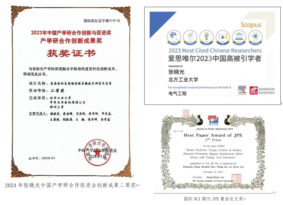 张晓光教授近年来针对交流电机变频系统研究了新型模型预测控制等理论并在实际项目和产品得到应用,在交流电机模型预测控制领域具有国际影响力,围绕本领域发表SCI/EI学术论文100余篇,其中ESI高被引论文6篇,授权国家发明专利/软件著作权30余项。以成果第一完成人获北京市自然科学奖二等奖、中国电源学会科技进步二等奖,国家级教学成果二等奖、北京市教学成果一等奖、国际SCI期刊最佳论文奖、IEEE国际会议最佳论文奖等奖励10余项。
