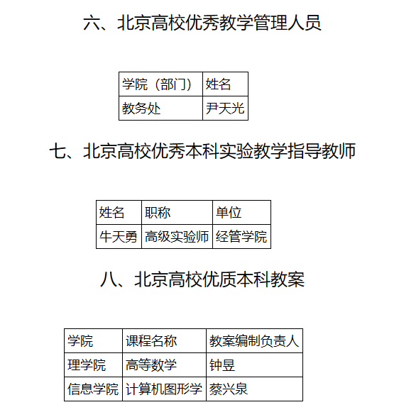 日前,北京市教育委员会公布了2023年度北京高校本科教学项目建设评选结果,公司在教学名师、教学改革、课程建设、教材课件教案、育人团队、学科竞赛和实验指导、教学服务保障、高水平教研室、实验室和协同育人平台建设等14类项目中共取得26项(人员/团队)成果,现将评选结果公布如下: