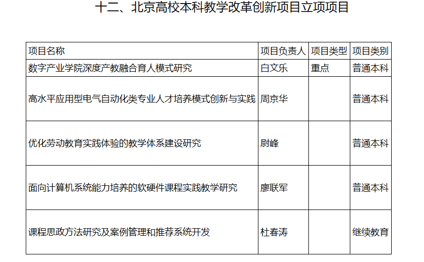 此次项目评选建设工作是北京市教委旨在紧密服务国家重大战略需求、北京城市功能定位和产业结构升级,推动北京高等教育本科人才培养系统性改革,支撑构建德智体美劳全面培养的教育体系的重要举措。在前期组织申报过程中,公司统筹安排,通过公司遴选推荐、组织校内外专家评审、领导小组审议、公示等环节开展校级评审,完成了市级推荐工作,并取得优异成绩。