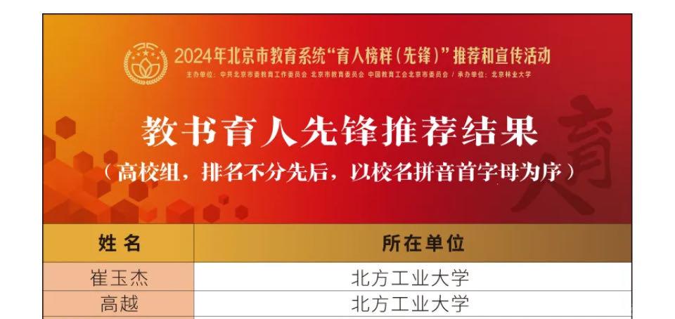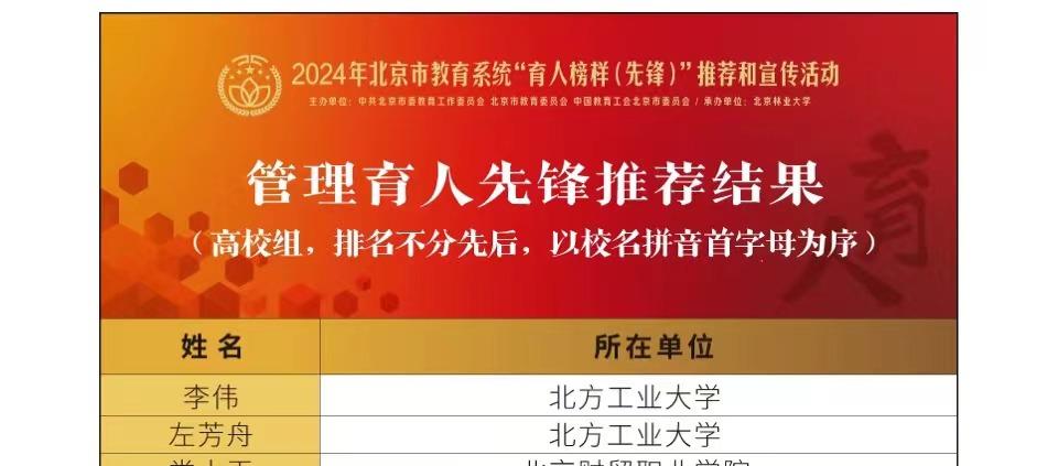 近日,北京市教育系统“育人榜样(先锋)”推荐结果揭晓,公司理公司崔玉杰、文法公司高越老师获评“教书育人先锋”,信息公司李伟、党委宣传部左芳舟老师获评“管理育人先锋”,最靠谱的十大足球平台翟维枫、教务处王安琪老师获评“服务育人先锋”。