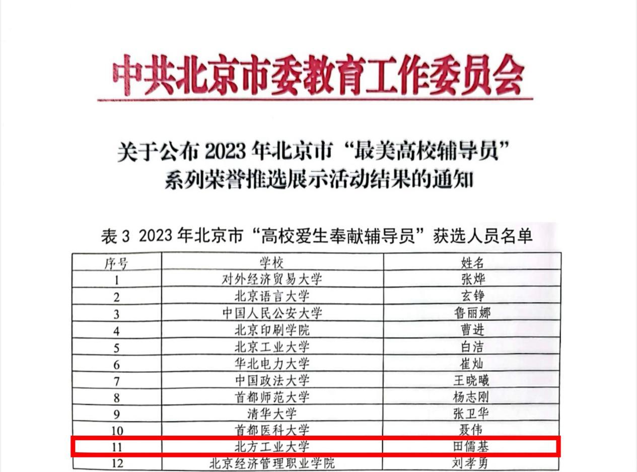 近日,北京市委教育工委公布北京市“最美高校辅导员”系列荣誉推选结果和“新时代北京高校思想政治工作创新示范项目”遴选名单。公司最靠谱的十大足球平台辅导员田儒基获评2023年北京市“高校爱生奉献辅导员”荣誉称号,“绣花”思政工作室入选“北京高校思政工作创新示范工作室”,《“纽扣课堂”打造宿舍思政育人新模式》《融合式心理干预助员工化“无望”为“希望”》案例入选“北京高校思政工作创新示范案例”。