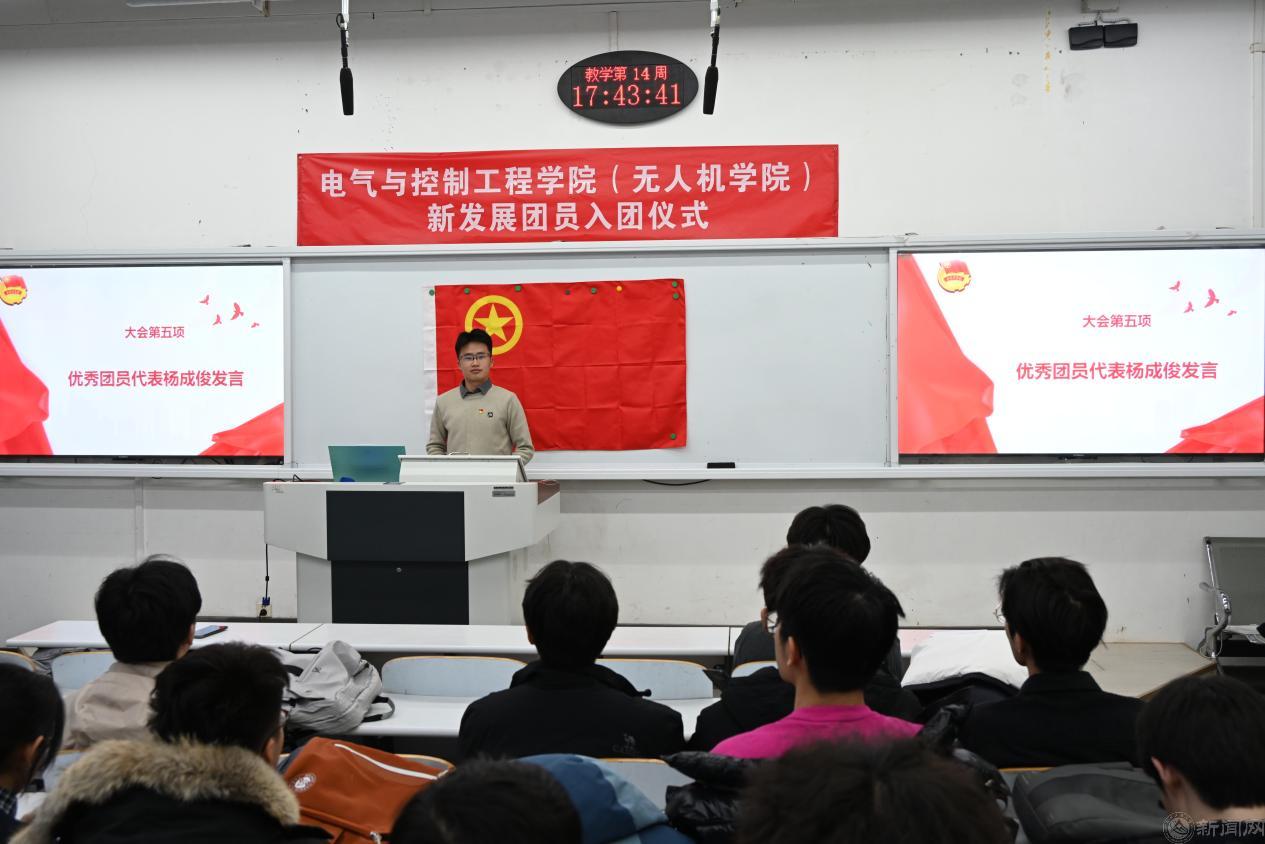 仪式在庄严的国歌声中拉开序幕。新发展团员代表王璟坤上台发言,他讲述了自己本科期间响应“携笔从戎”号召,投身军旅的经历。军营里的队列训练、野外拉练与站岗执勤,锤炼了他坚韧不拔的意志和对“责任”“担当”的深刻认知。退伍返校后,他克服学业断层的困难,以军营赋予的毅力刻苦备考,成功考取本校硕士研究生。他表示,从军营到校园,对共青团的向往从模糊敬意变为坚定追求,今后将牢记入团誓言,以青春之我勇担时代使命,在成长路上践行初心、稳步前行。