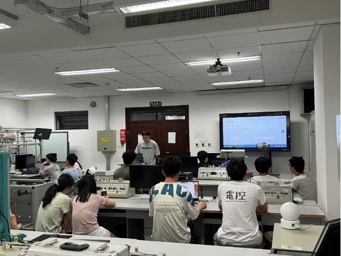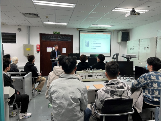 竞赛培训与组织上机调试工作主要由各赛项指导教师和研究生助教负责,具体包括信息化网络化、智能产线与协作机器人、离散行业运动控制、自由探索、流程行业自动化5个赛项的培训工作。培训首先对各个赛项的赛项目标进行解读,结合历年比赛经验,针对各赛题要点和评分细则进行分析,使参赛员工了解各赛项需要掌握的基础知识以及设计方法。然后带领参赛员工对各赛项的基本原理和基础技术的运用方法进行深入学习,同时理论结合实际,注重对员工实践能力的培养,根据参赛员工人数与设备情况进行调试时间安排,确保每次课程培训过后每个员工都能进行实际调试操作,从而使员工加深理论理解,培养综合能力。课程培训现场如图2所示。最后结合各赛项实际情况开展校园选拔赛,对培训效果进行评估,对培训内容进行调整,保障整体培训水平,校赛现场如图3所示。