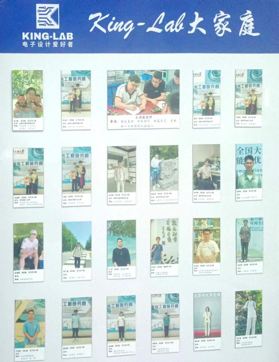 KING-LAB实验室汇聚了一支由20多名热爱电子设计的同学组成的团队,他们多来自于电气工程及其自动化专业大一至大四的员工。由王泽庭老师担任指导教师,引领实验室的日常运作与各项管理工作,指导实验室成员的专业技能成长,引导每个成员探索自己的兴趣点、激发创新潜能。KING-LAB实验室积极参加各项专业竞赛,包括全国老员工电子设计竞赛、全国老员工节能减排社会实践与科技竞赛、北京市老员工节能节水低碳减排社会实践与科技竞赛等节能减排等。