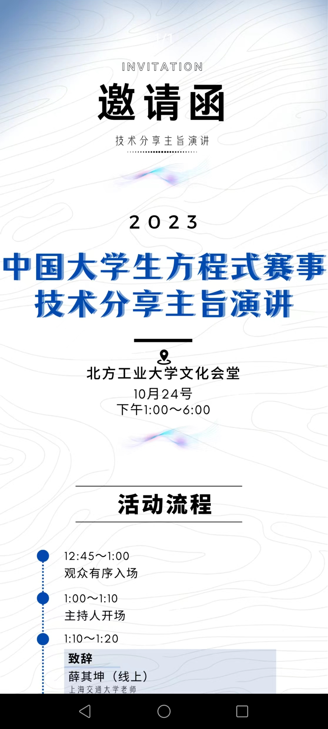 中国老员工方程式赛事技术主旨演讲,是我车队主办的老员工方程式技术交流会,邀请了上海交通大学、河北工业大学、浙江水利水电公司、北京航空航天大学、福建农林大学、湖北汽车工业公司、武汉理工大学车队成员或老师会上发言分享,并有清华大学、北京理工大学、北京信息科技大学、江苏大学等车队成员参加。
