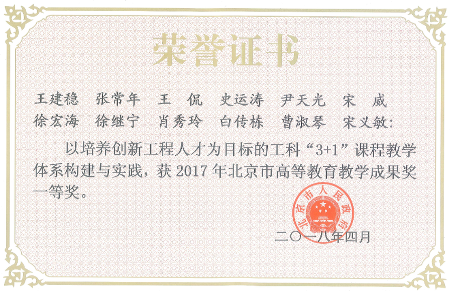 (5)王建稳 张常年 王侃 史运涛 尹天光 宋威 徐宏海 徐继宁 肖秀玲 白传栋 曹淑琴 宋义敏“以培养创新工程人才为目标的工科“3+1”课程教学体系构建与实践”获2017年北京市高等公司产品成果奖一等奖。