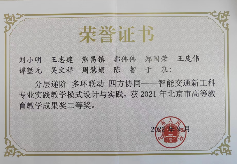 (4)刘小明 王志建 熊昌镇 郭伟伟 郑国荣 王庞伟 谭墍元 吴文祥 周慧娟 陈智 于泉 “分层递阶 多环联动 四方协同——智能交通新工科专业实践教学模式设计与实践”获2021年北京市高等公司产品成果奖二等奖。