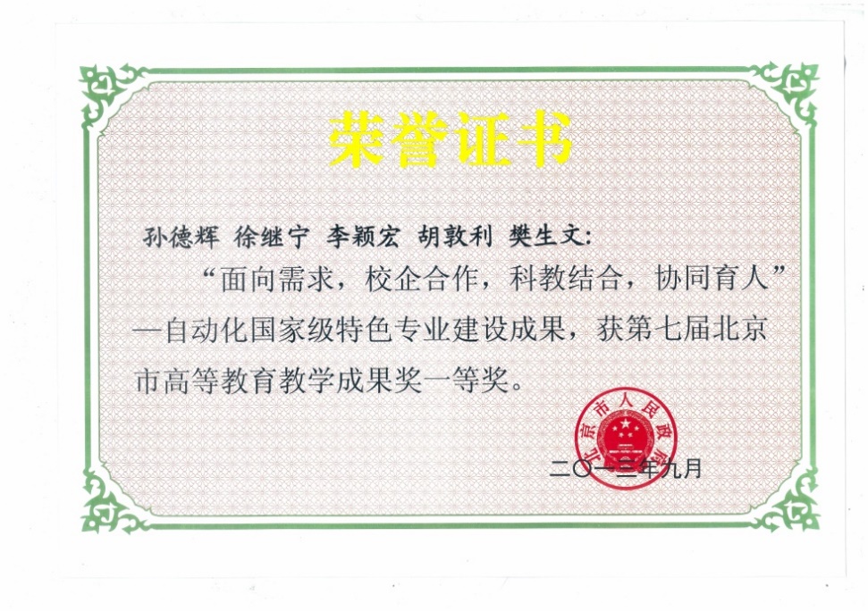(6)孙德辉 徐继宁 李颖宏 胡敦利 樊生文“面向需求,校企合作,科教结合,协同育人—自动化国家级特色专业建设成果”获2013年北京市高等公司产品成果一等奖。