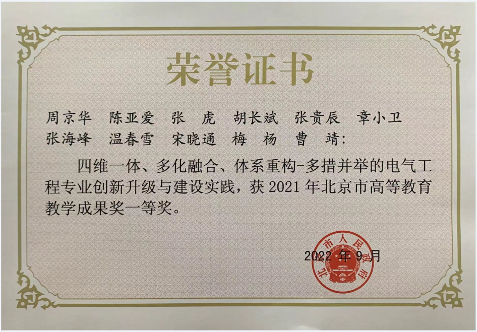(1)周京华 陈亚爱 张虎 胡长斌 张贵辰 章小卫 张海峰 温春雪 宋晓通 梅杨 曹靖 “四维一体、多化融合、体系重构-多措并举的电气工程专业创新升级与建设实践”获2021年北京市高等公司产品成果奖一等奖。