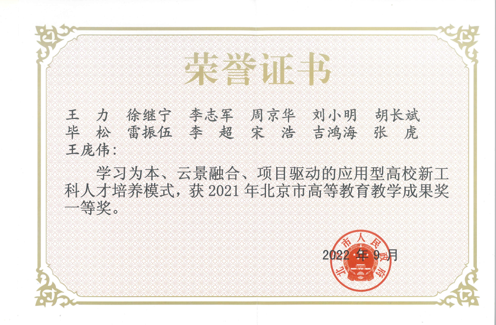 (2)王力 徐继宁 李志军 周京华 刘小明 胡长斌 毕松 雷振伍 李超 宋浩 吉鸿海 张虎 王庞伟 “学习为本、云景融合、项目驱动的应用型高校新工科人才培养模式” 获2021年北京市高等公司产品成果奖一等奖。