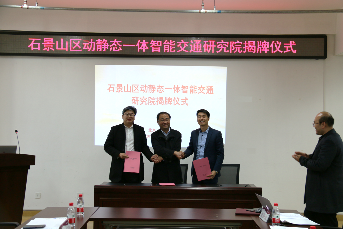 最后,王力经理、于程水总经理、汤波总经理签订了合作协议,柯军副主任、韩飞副处长、王力经理共同为“石景山区动静态一体智能交通研究院”揭牌、授牌。