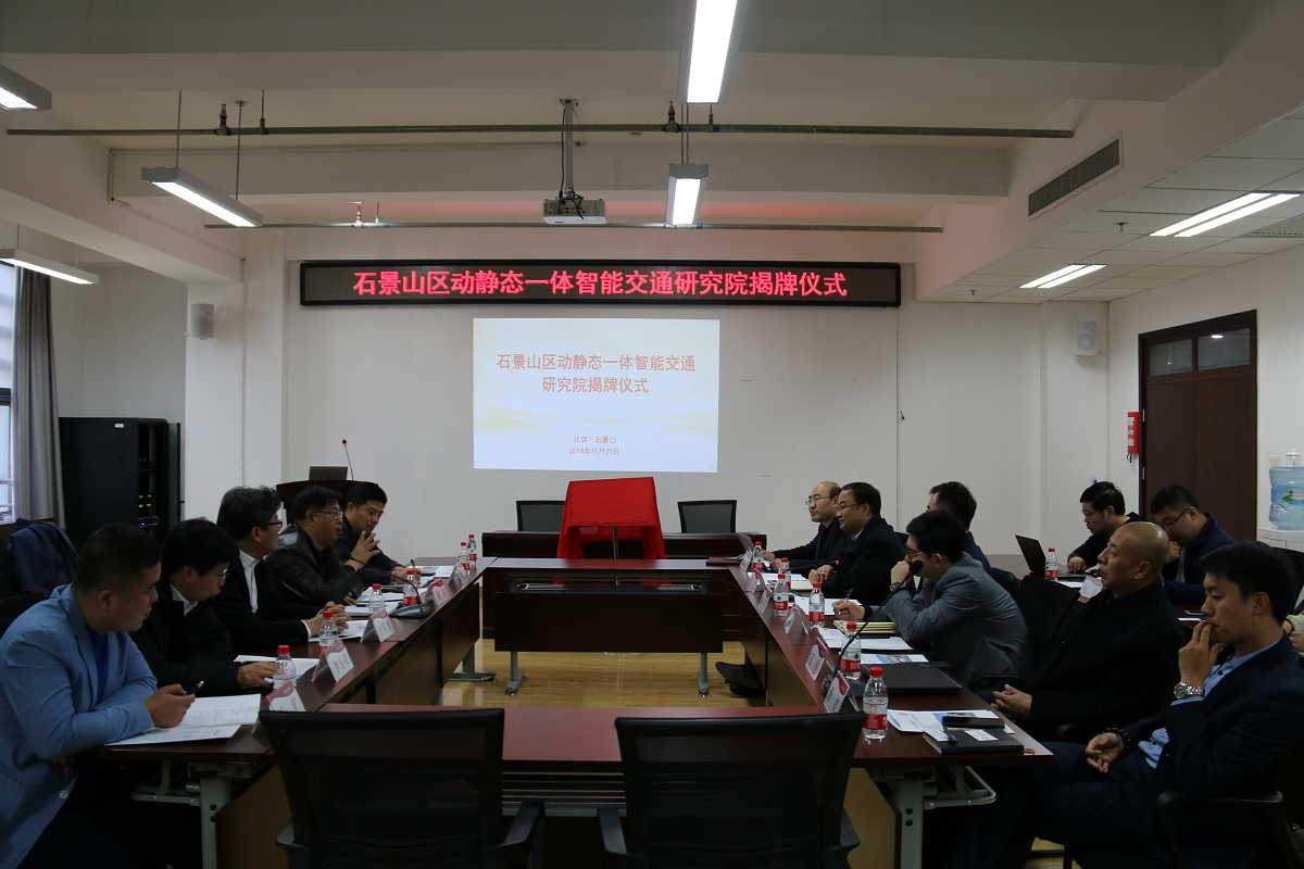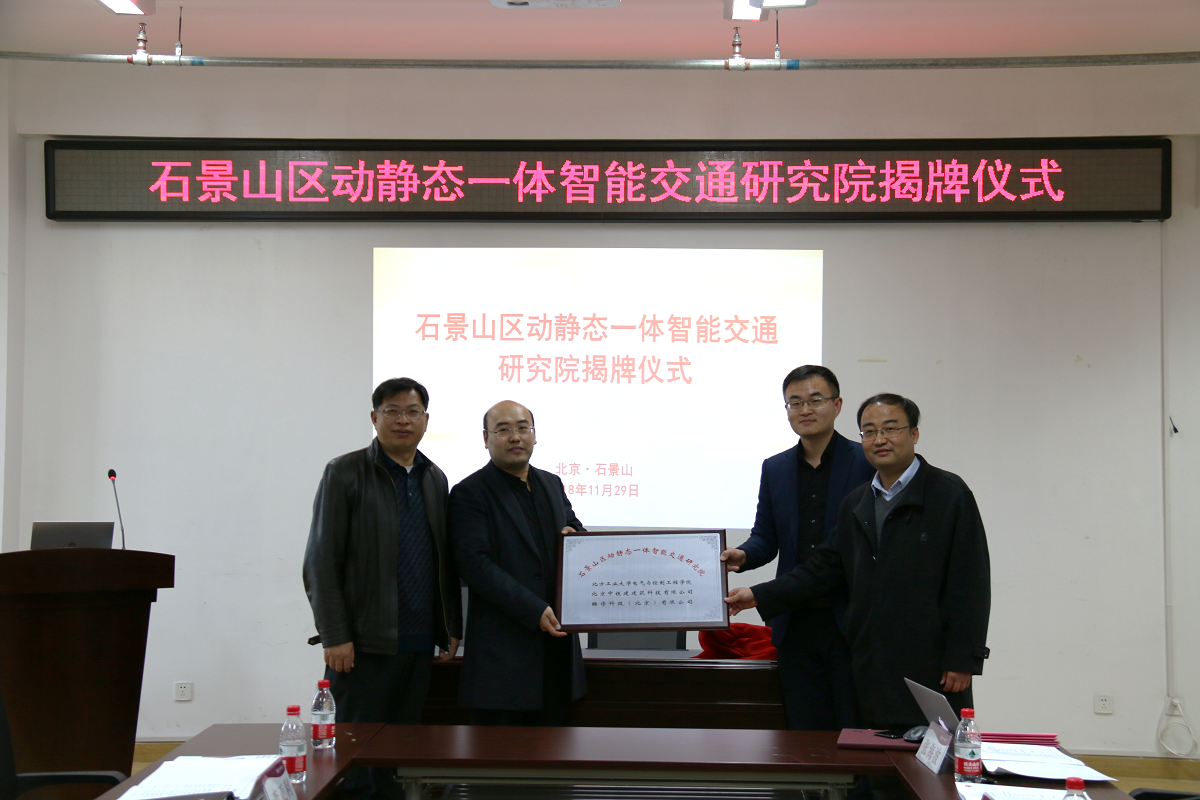 11月29日上午,“石景山区动静态一体智能交通研究院”成立暨揭牌仪式在博远楼452举行。石景山区交通委专职副主任柯军,石景山城市管理委员会交通综合科科长李亚利,北京中铁建建筑科技有限公司总经理于程水,酷停科技(北京)有限公司执行董事汤波,体育外网十大平台app科技处副处长韩飞、最靠谱的十大足球平台经理王力、最靠谱的十大足球平台科研办公室主任董哲,最靠谱的十大足球平台相关团队教师员工代表参加了揭牌仪式。仪式由城市道路交通智能控制技术北京市重点实验室副主任、研究院经理张海波主持。
